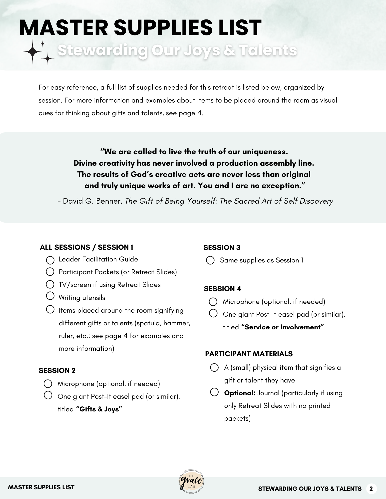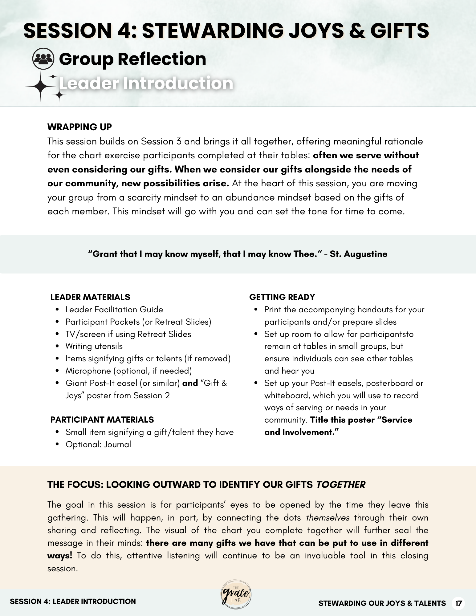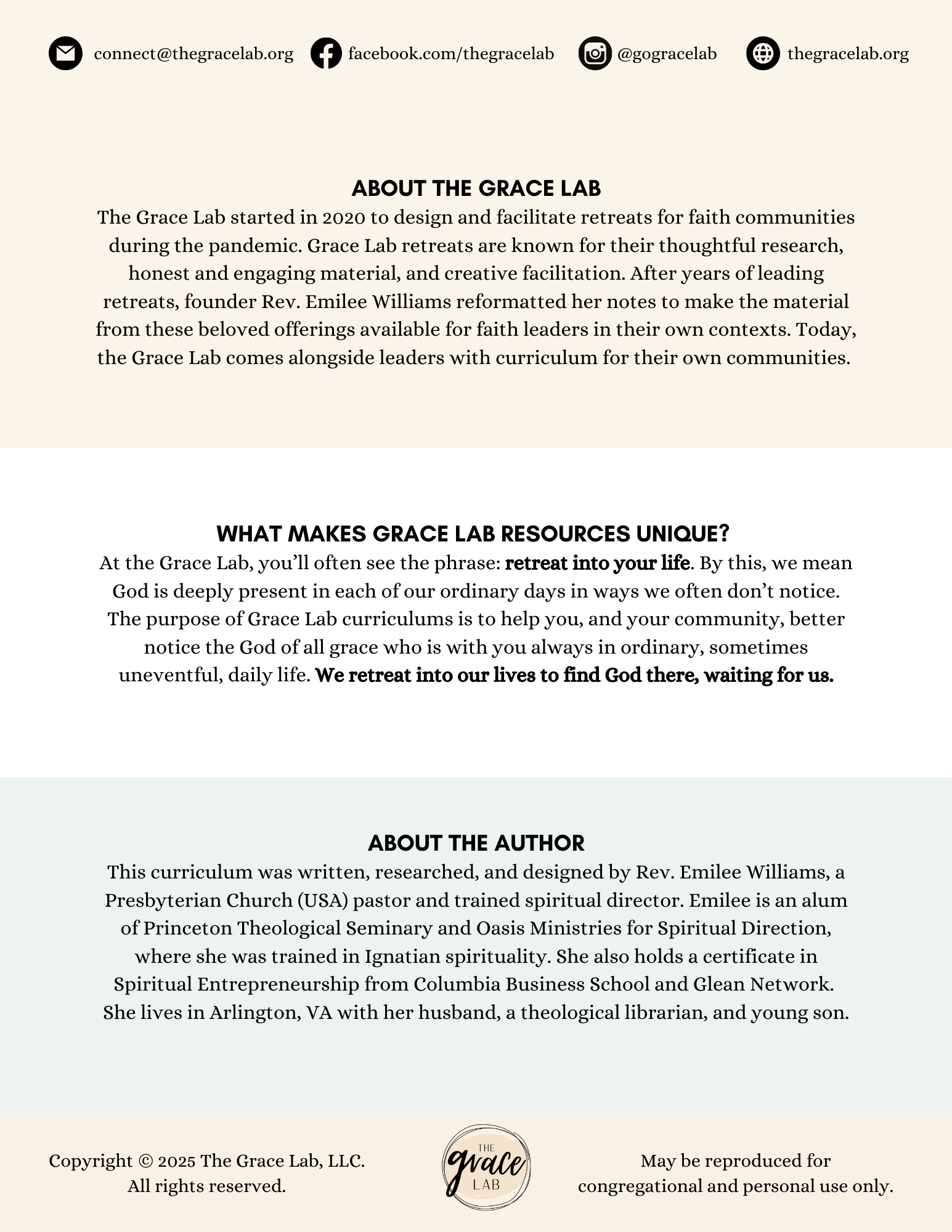 Grace Lab Store Stewarding Our Joys & Talents Curriculum $40.00 A Day By the Fire Curriculum $60.00 Spirituality for Daily Life Curriculum $40.00 Coming Soon to the Grace Lab Store Waiting With God $40.00